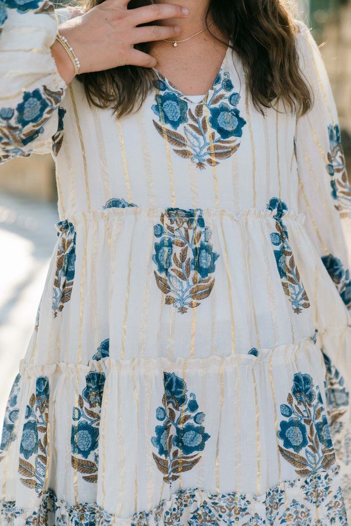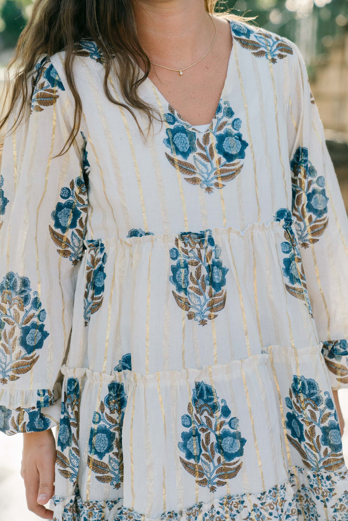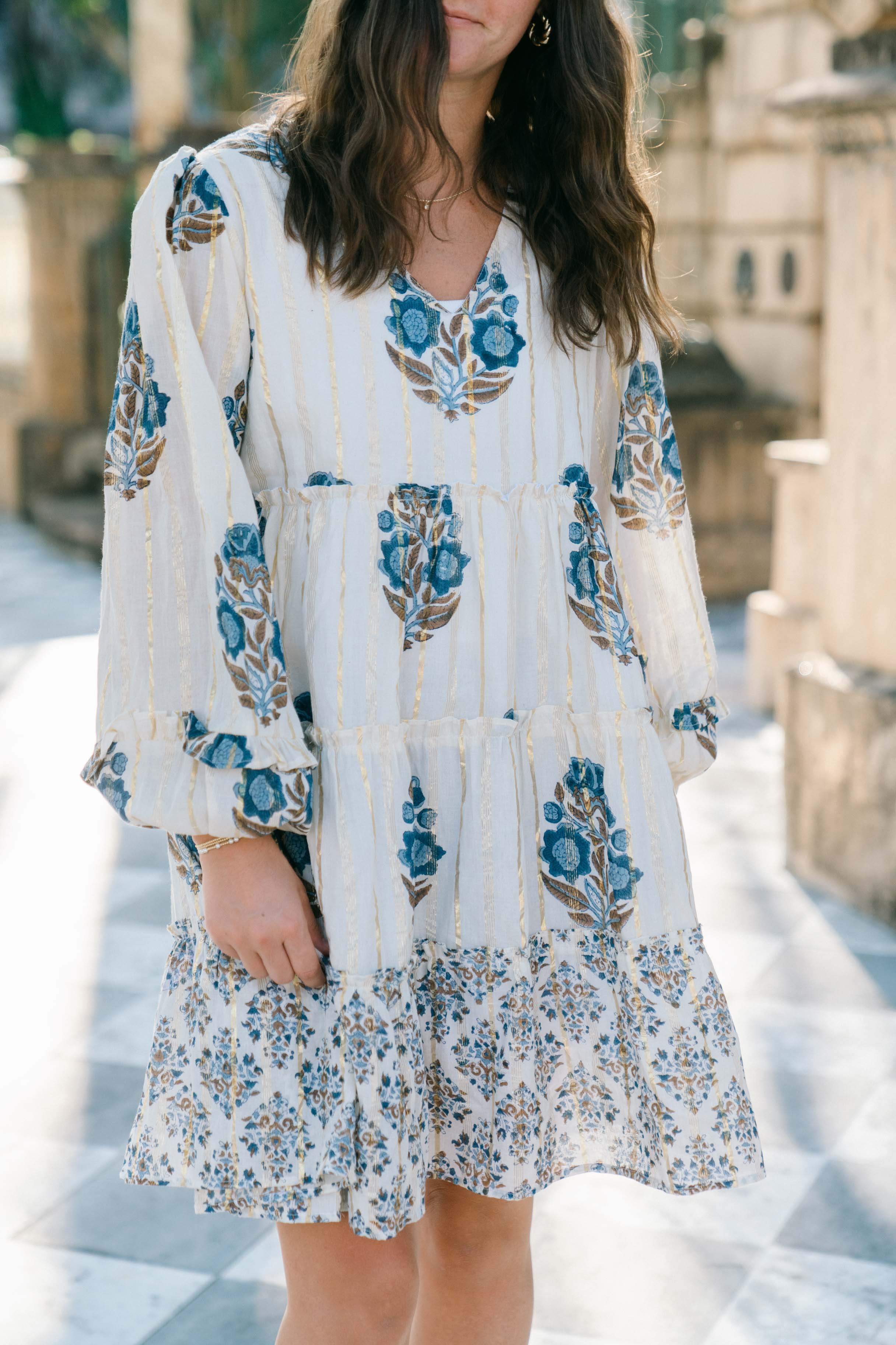 The Skye is an A-line silhouette with a relaxed fit that features a v-neckline, long blouson sleeves with slightly puffed shoulders, and side pockets.