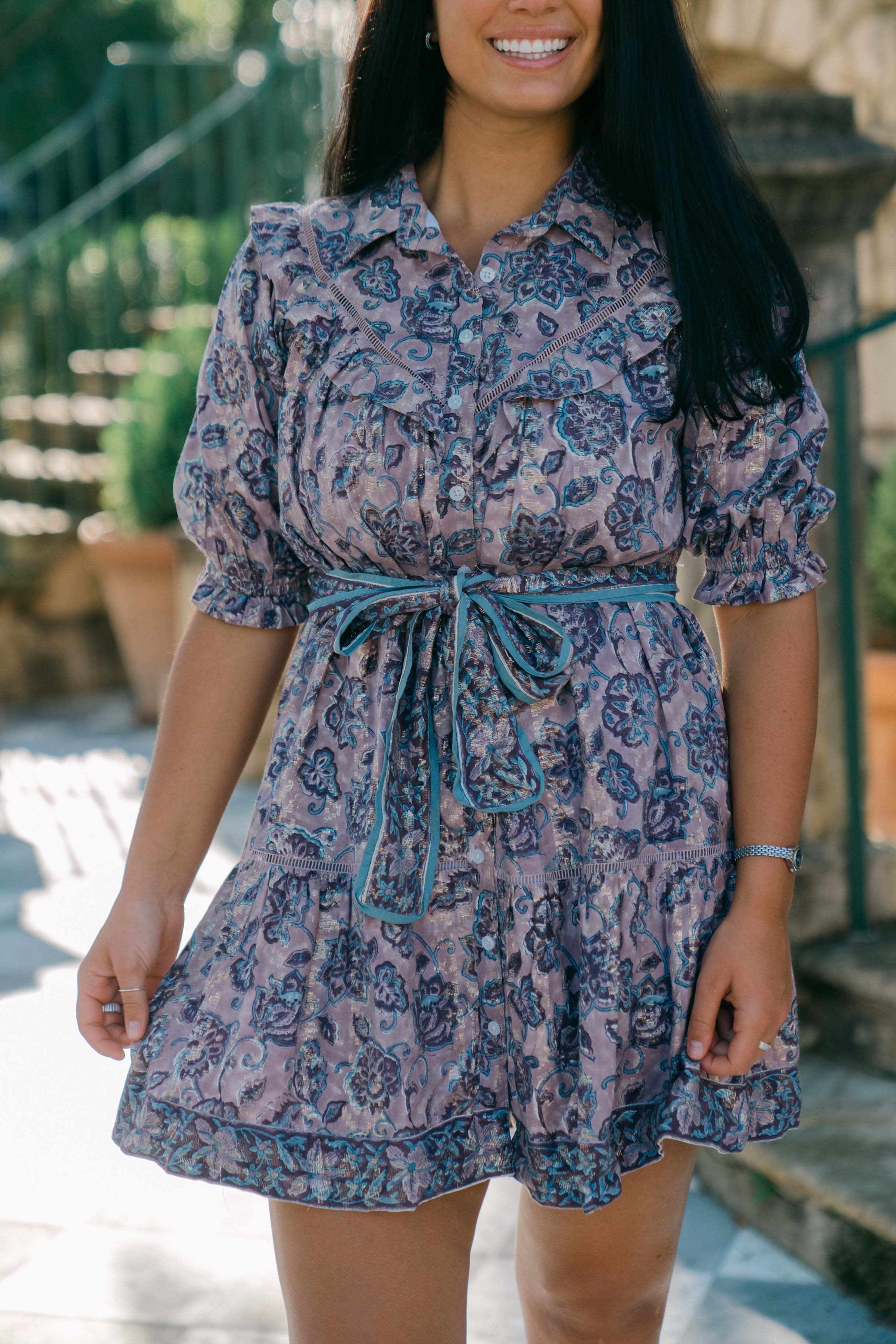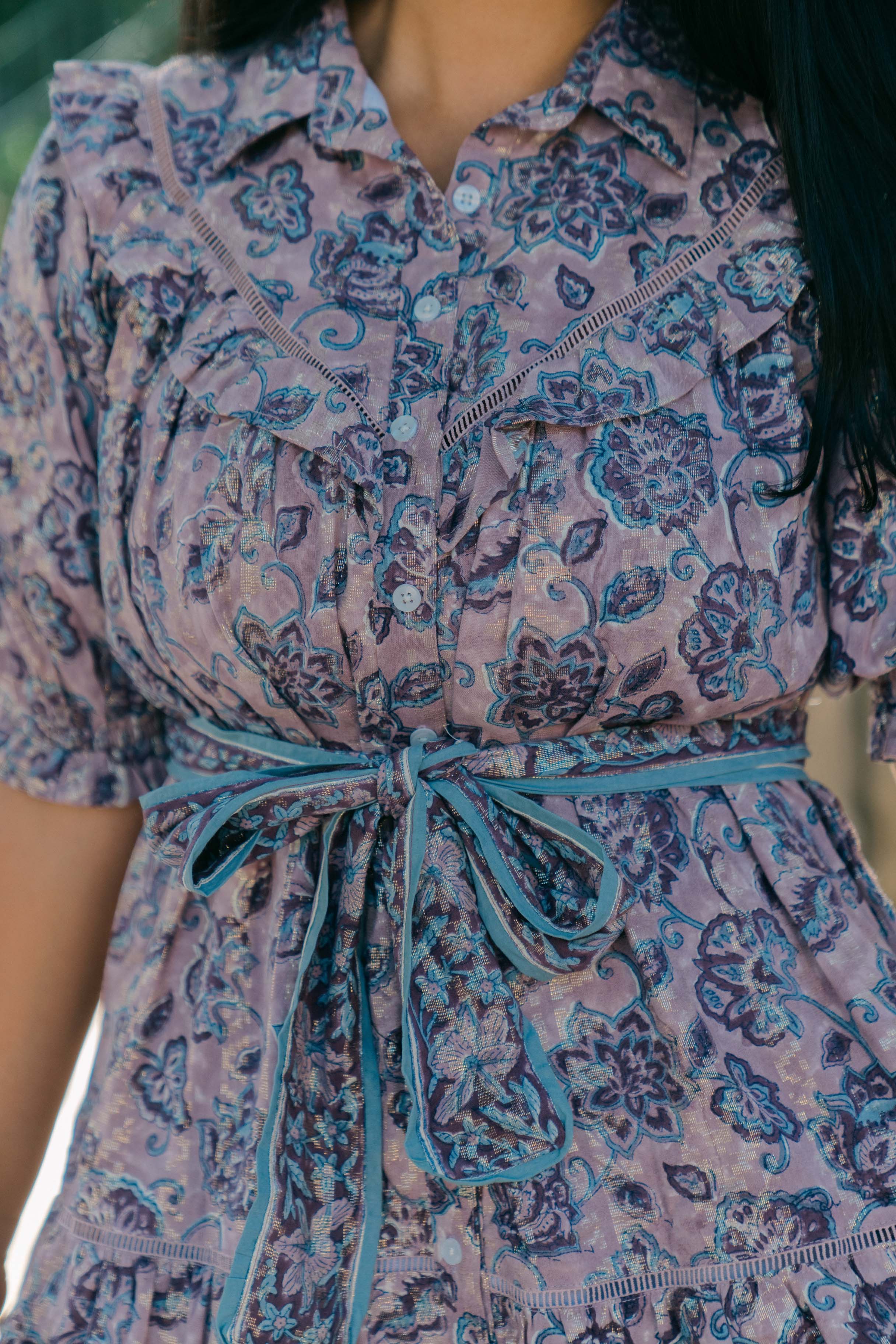 The Autumn features a button front placket, ruffle at the yoke, relaxed fit, a removable belt, and side pockets.