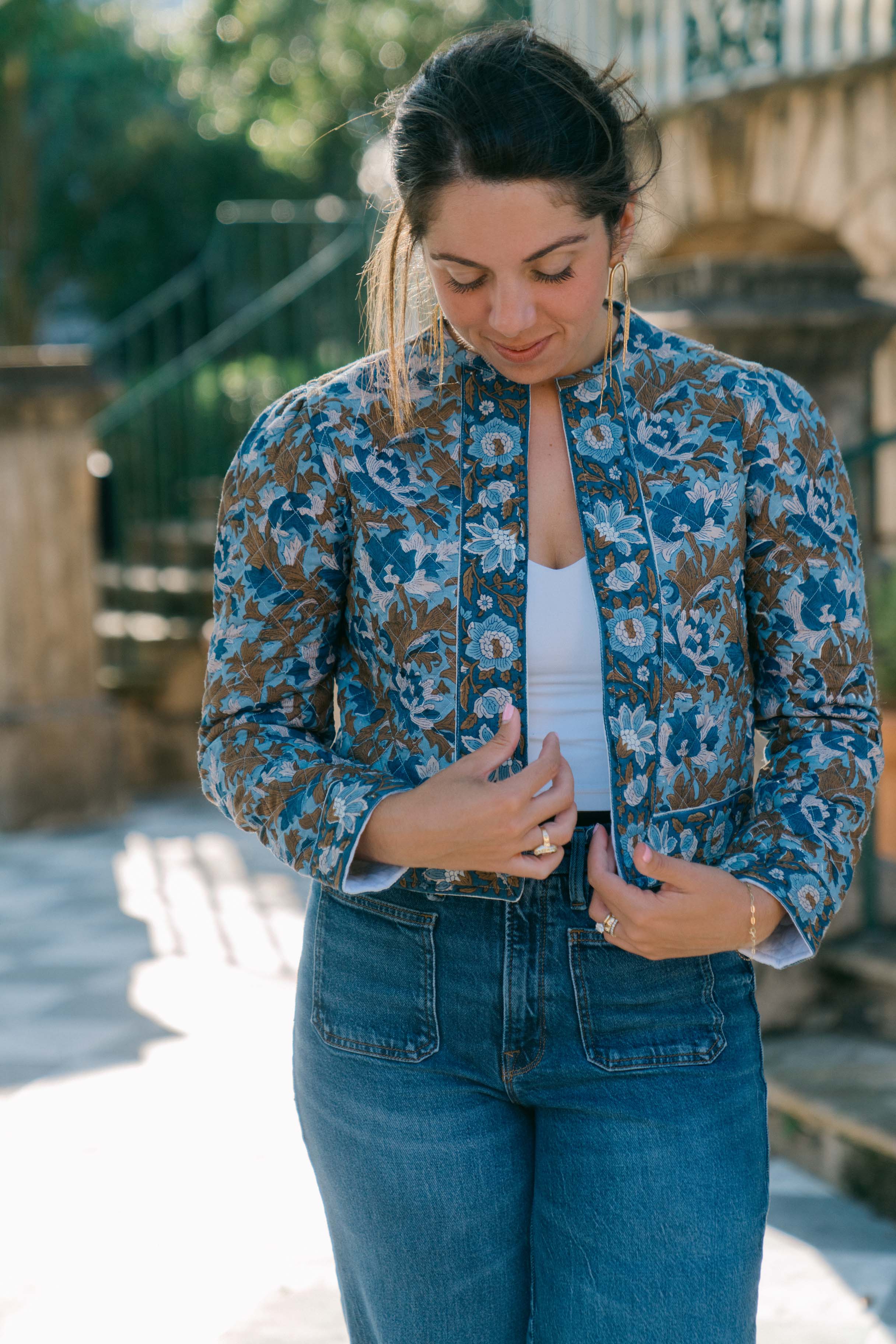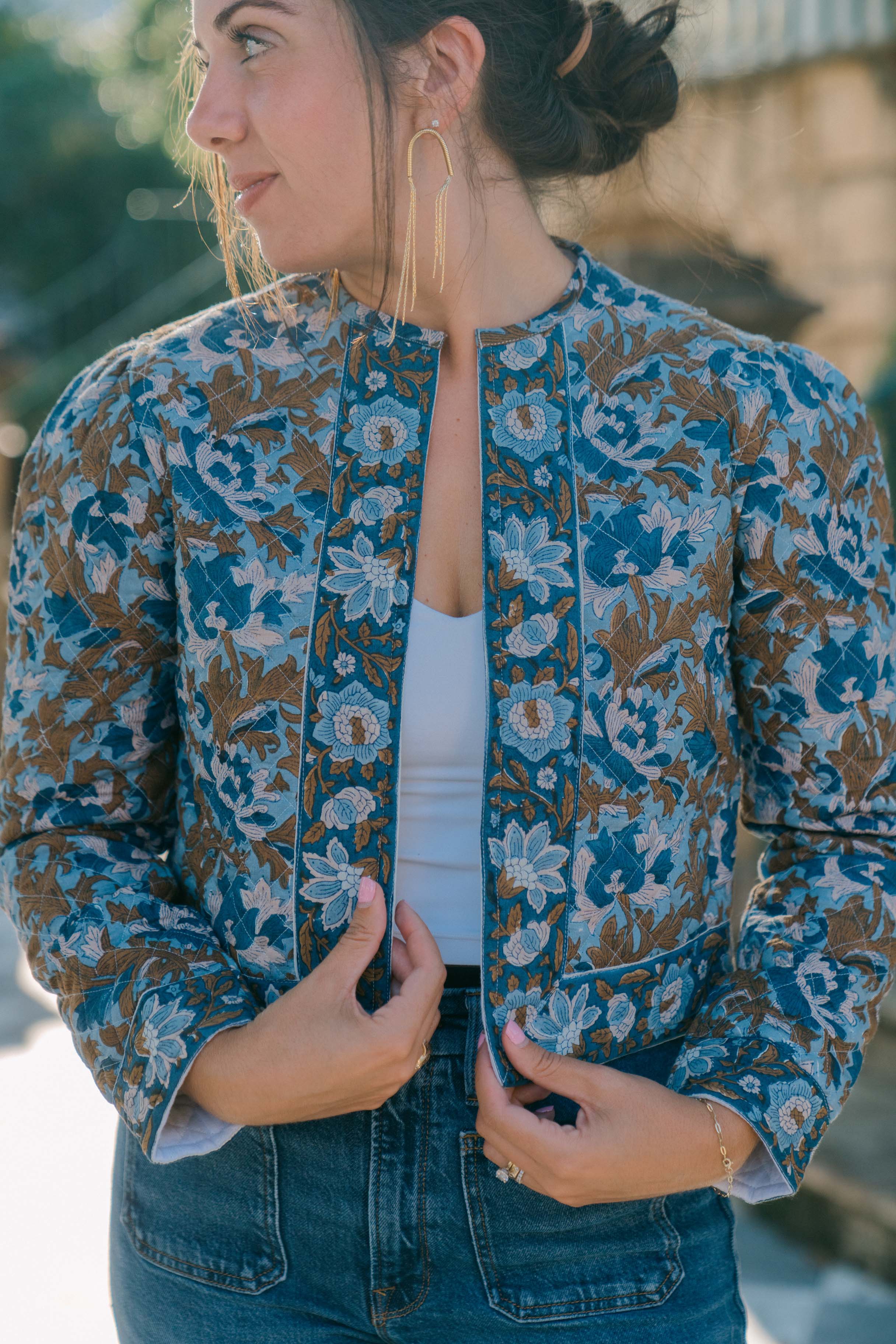 The Giselle Jacket features puff shoulders and full-length sleeves. The hook and eye closure ensures a secure fit, while the contrasting trim detail adds a pop of color.