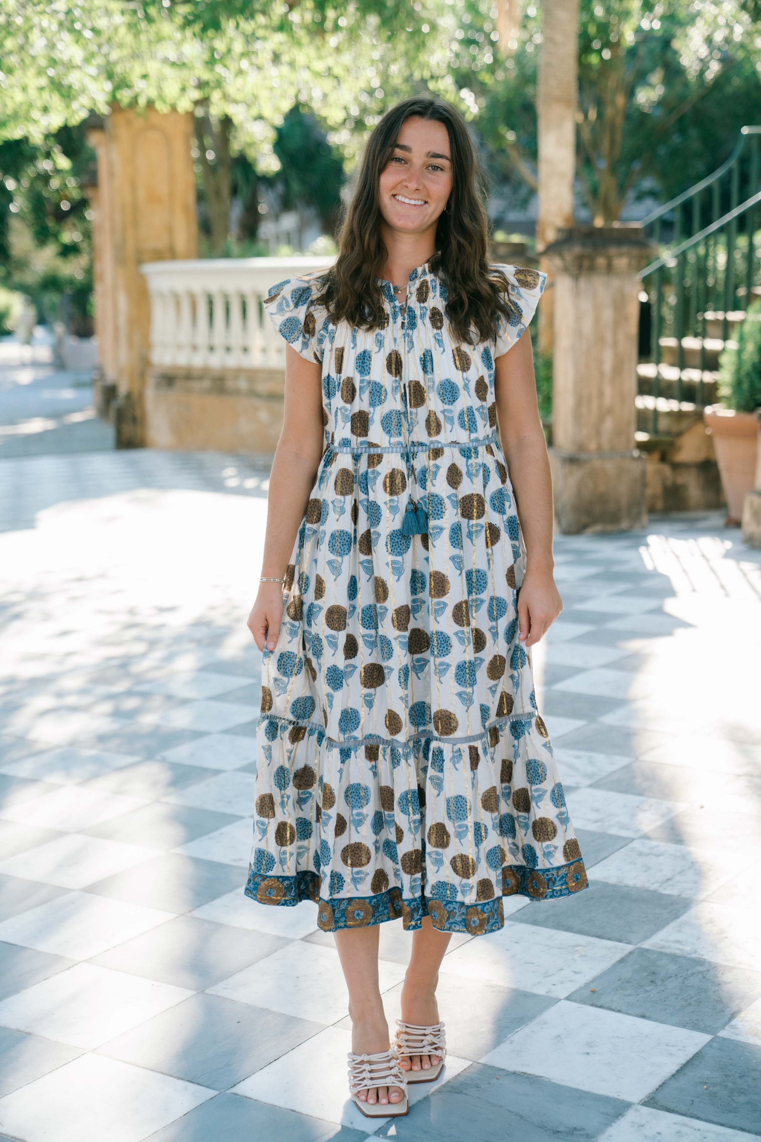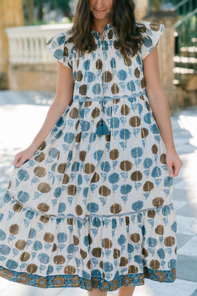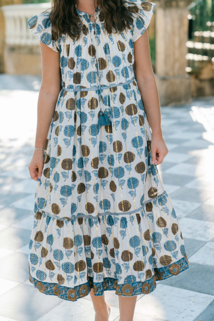 The Nova Dress is breezy and feminine, designed with flutter sleeves and a flattering v-neckline finished with a tie closure and button details. Contrasting trim along the hem adds a refined touch, making this style perfect for both casual days and elevated occasions.