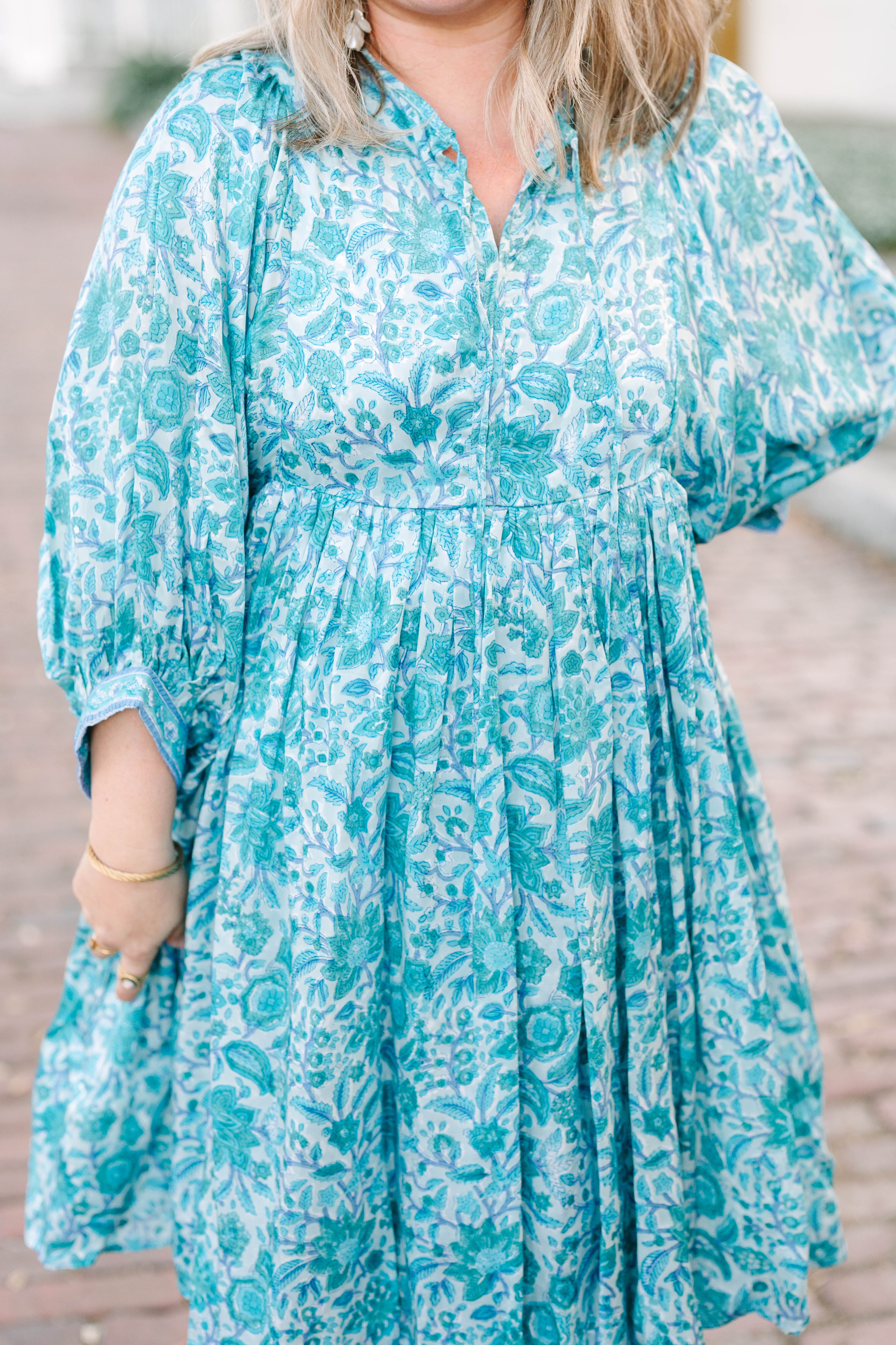 The Clover Mini is a simple, light, and flowy design featuring billowy sleeves, front tie closure, and a full skirt with lining. Celebrating generational craftsmanship with prints on the Indian market for generations.