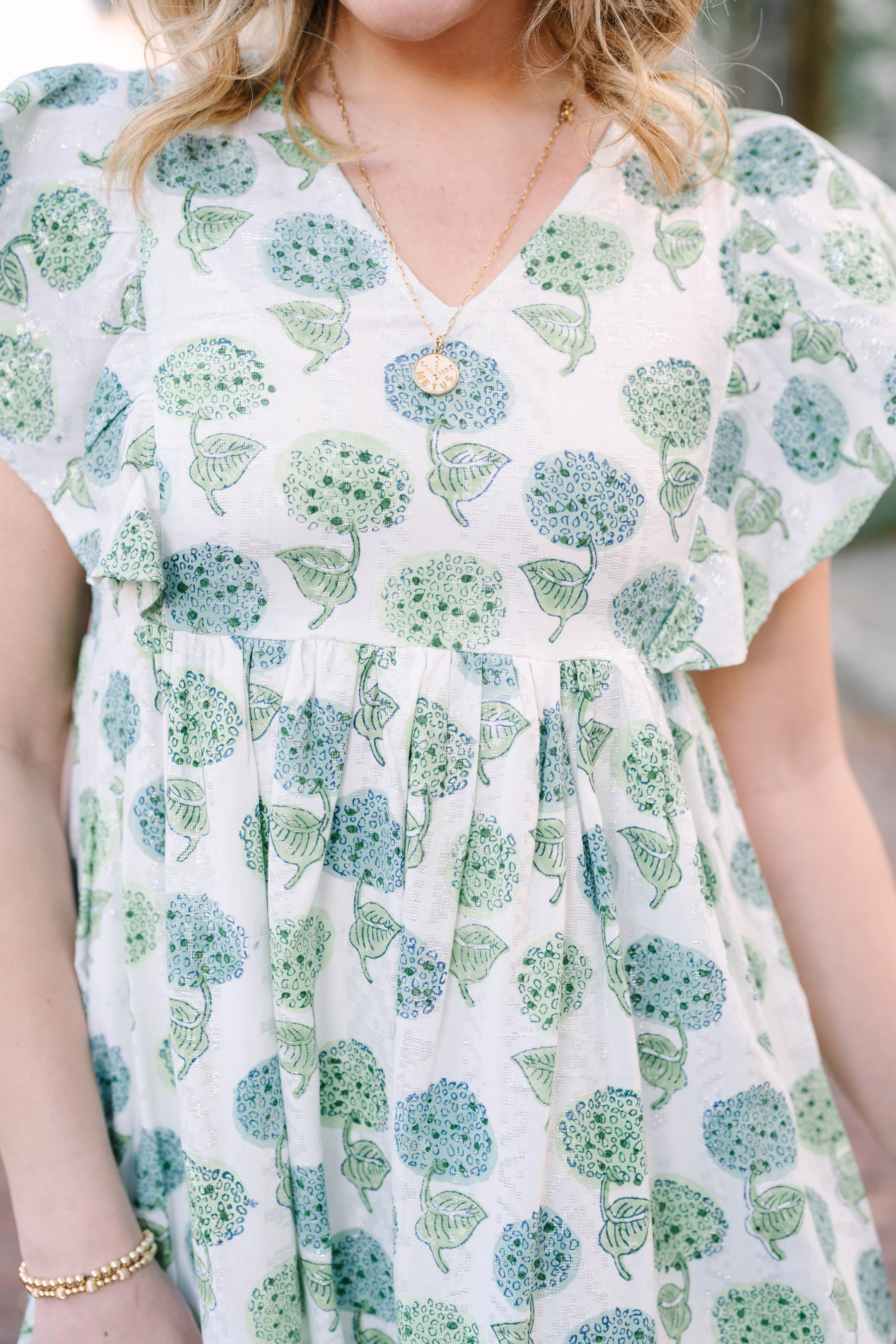 The Lyra features a V-neckline, a smocked side panels on the bodice, and side pockets.