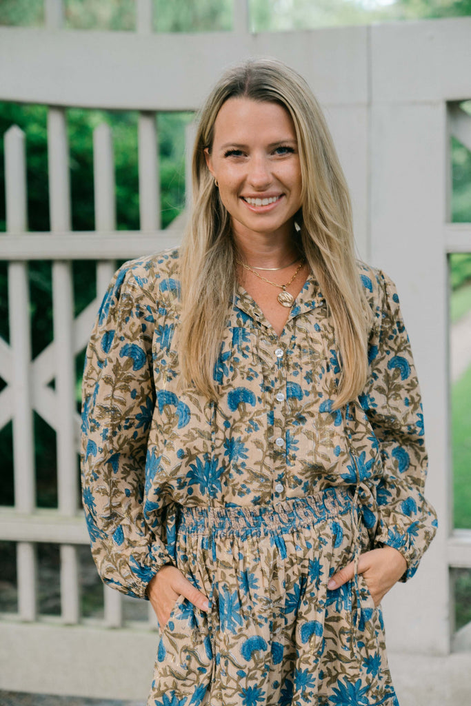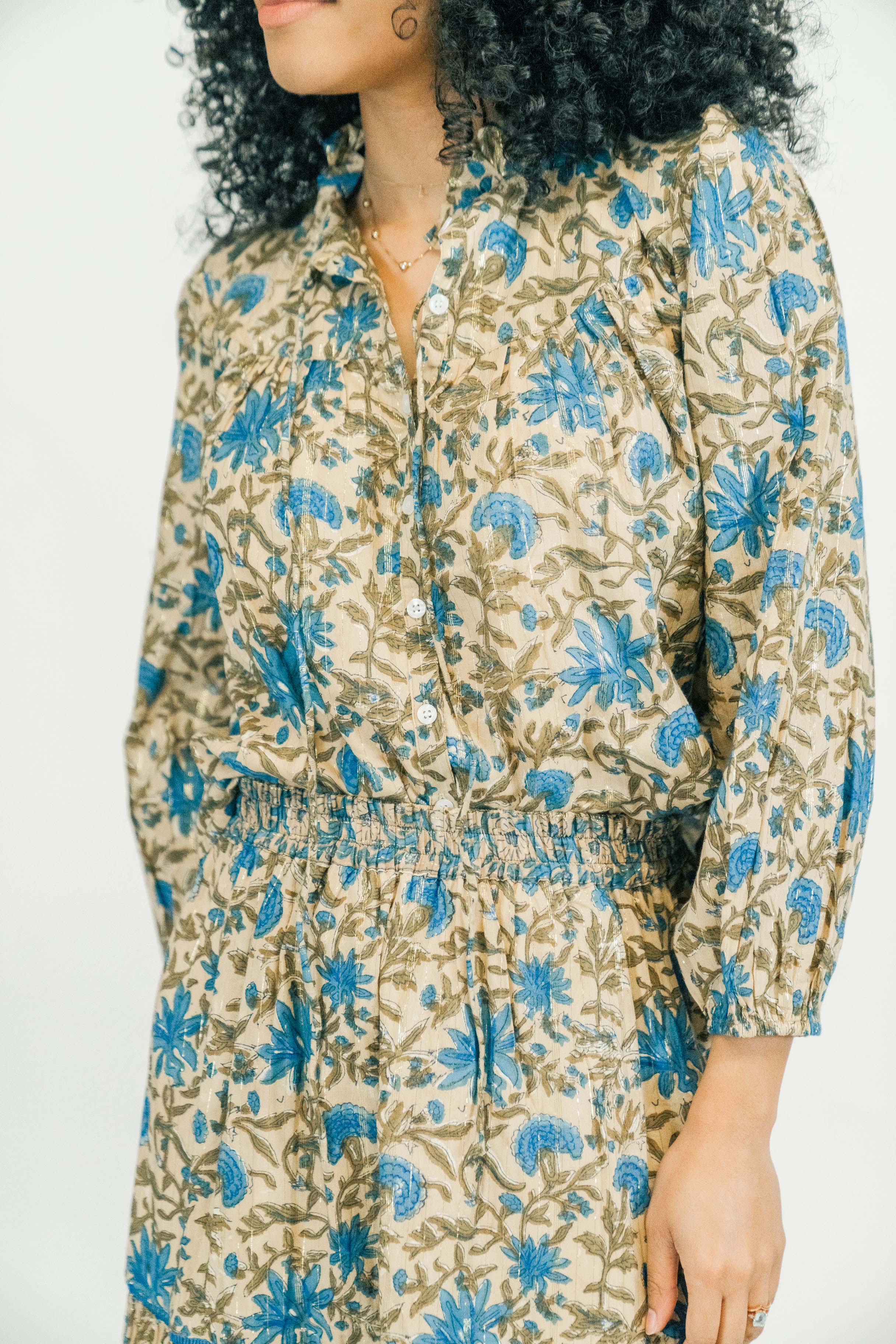 The Olive Blouse is our go-to blouse. It features a ruffled collar with an adjustable tie, long sleeves with an elasticated hem, and a front button closure. Pair with our Lana skirt for the perfect ensemble.