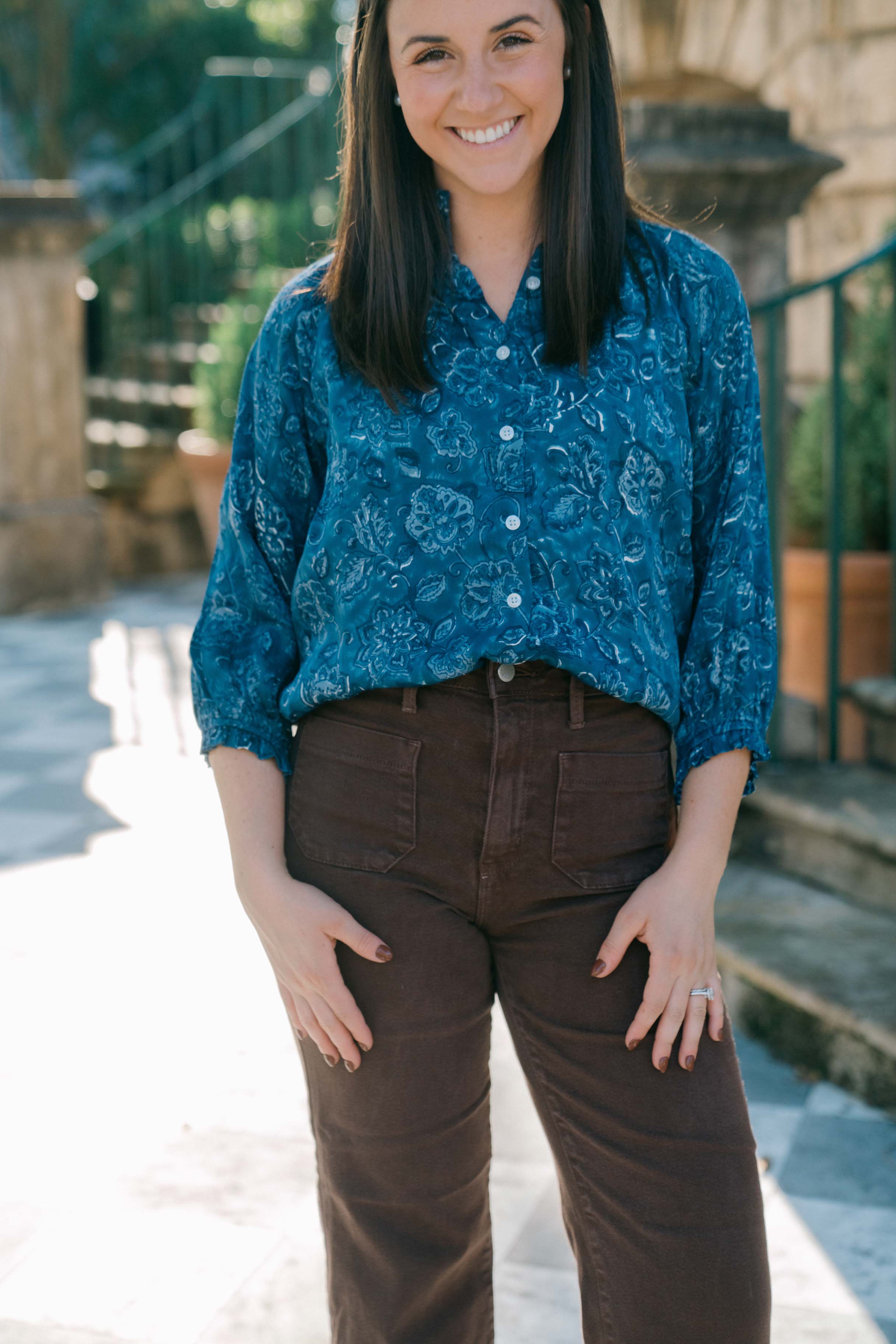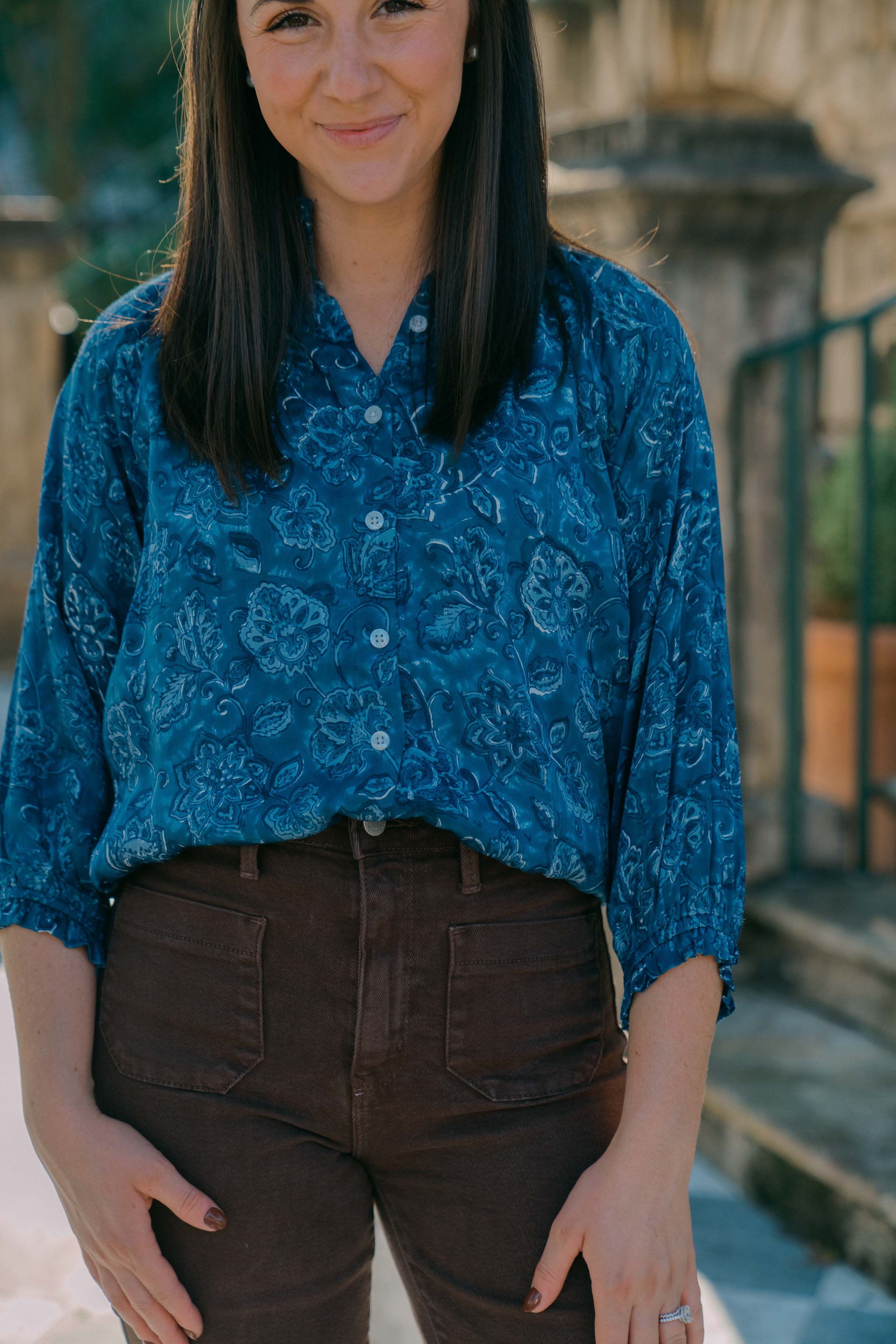 The Sage Blouse is a closet staple. This style features a mandarin collar, buttons from collar to hem, and long puff sleeves.