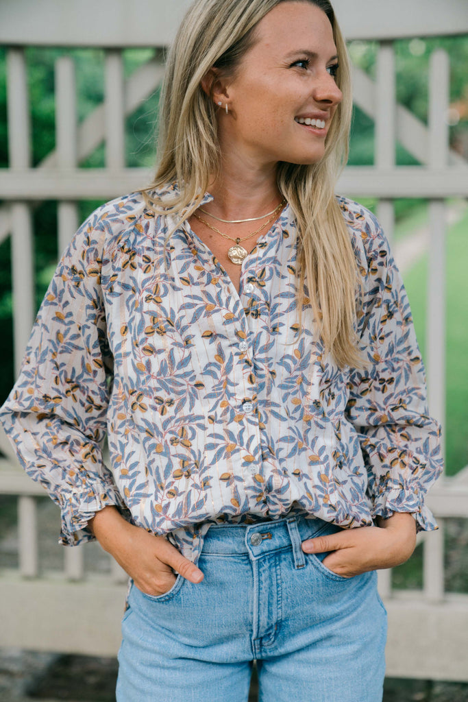 The Sage Blouse is a closet staple. This style features a mandarin collar, buttons from collar to hem, and 3/4 length sleeves with elasticated ruffle cuffs. Pair with our Lana Skirt for a matching set.