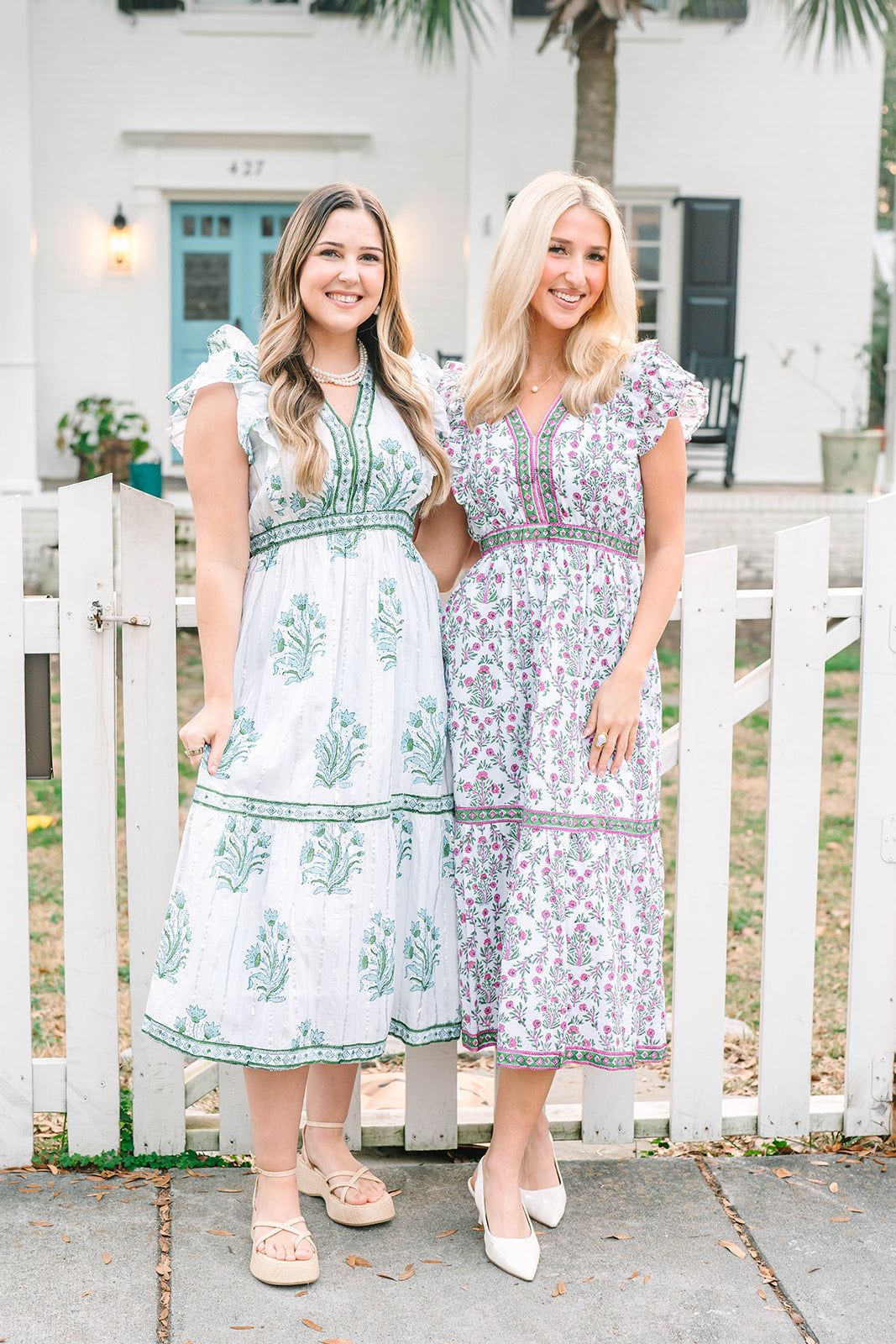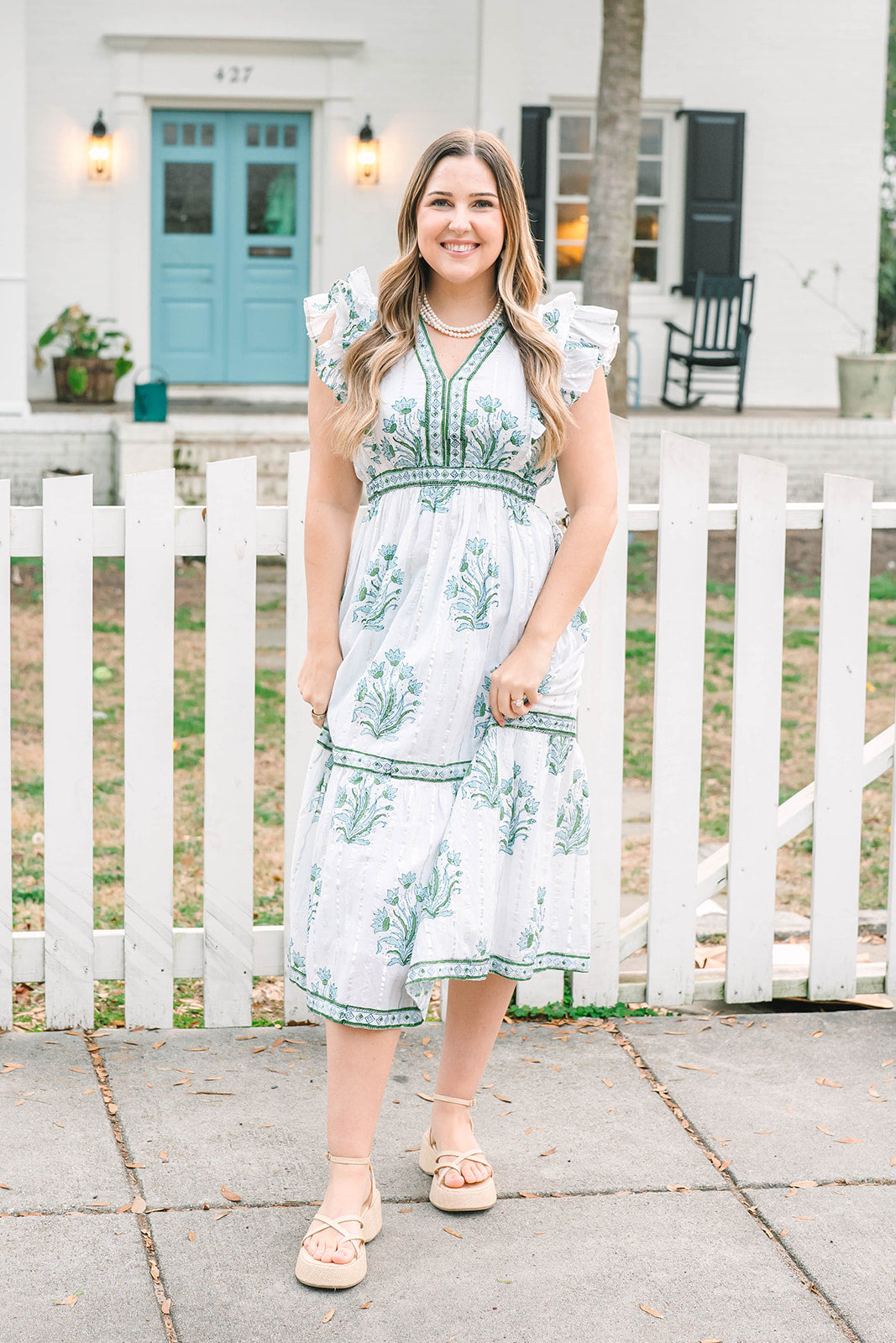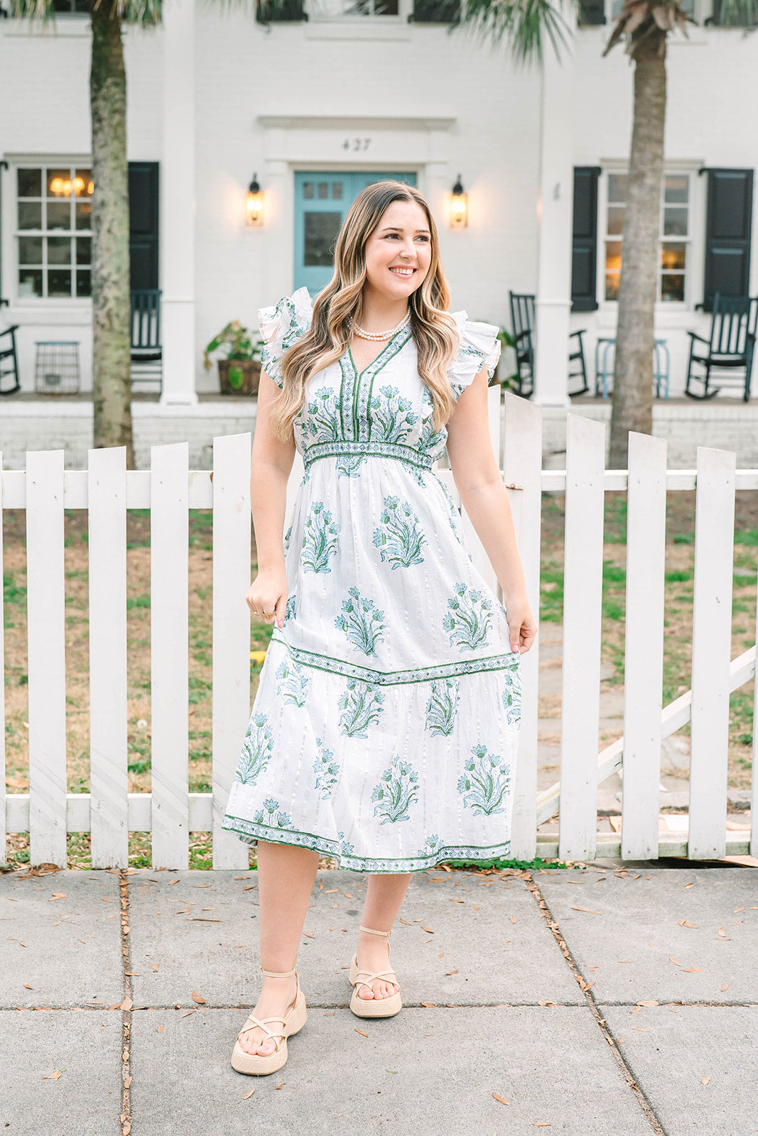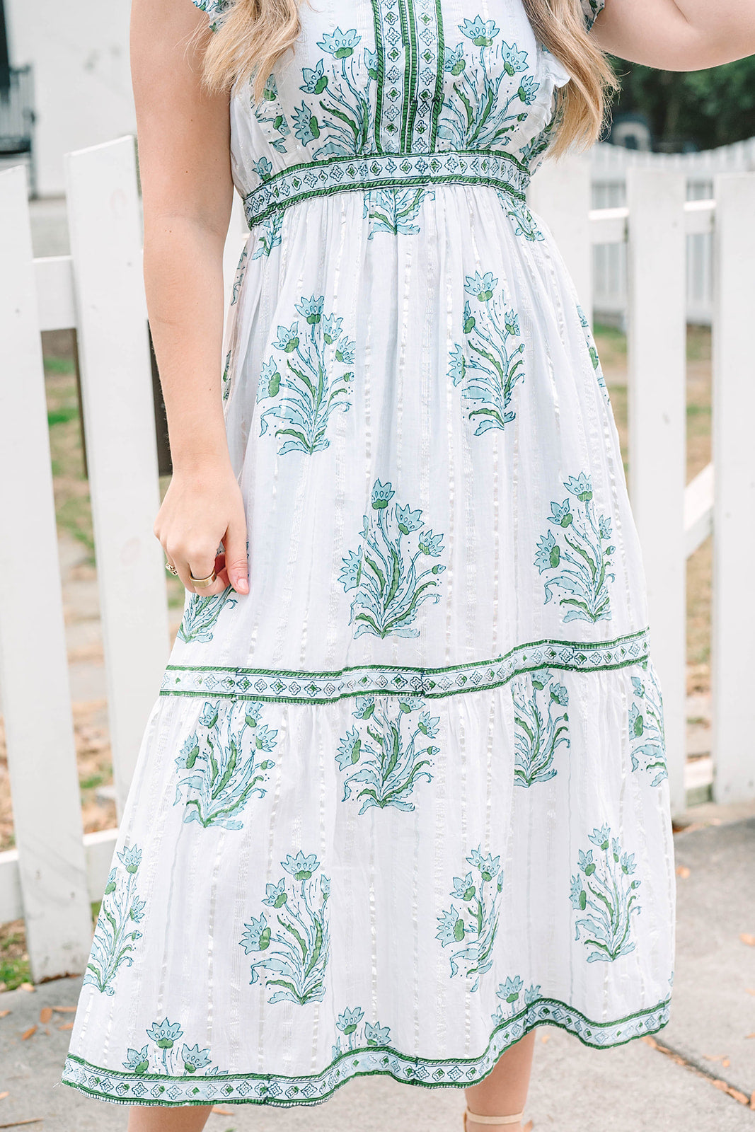 The Kira features a v-neckline, elastic waistband, short flutter sleeves, and contrasting trim on the neckline and skirt.