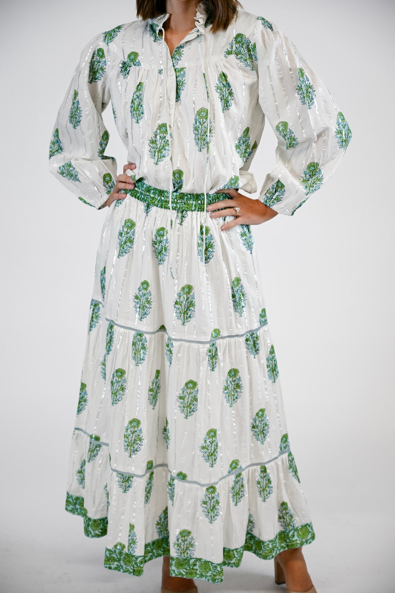 Effortlessly feminine and beautifully detailed, the Lana Skirt is a warm-weather essential. Designed with a comfortable elastic waistband and a flowing tiered silhouette, it offers both ease and elegance. Contrasting trim adds a polished touch of sophistication. Pair with the Olive Blouse for a perfectly coordinated summer ensemble.