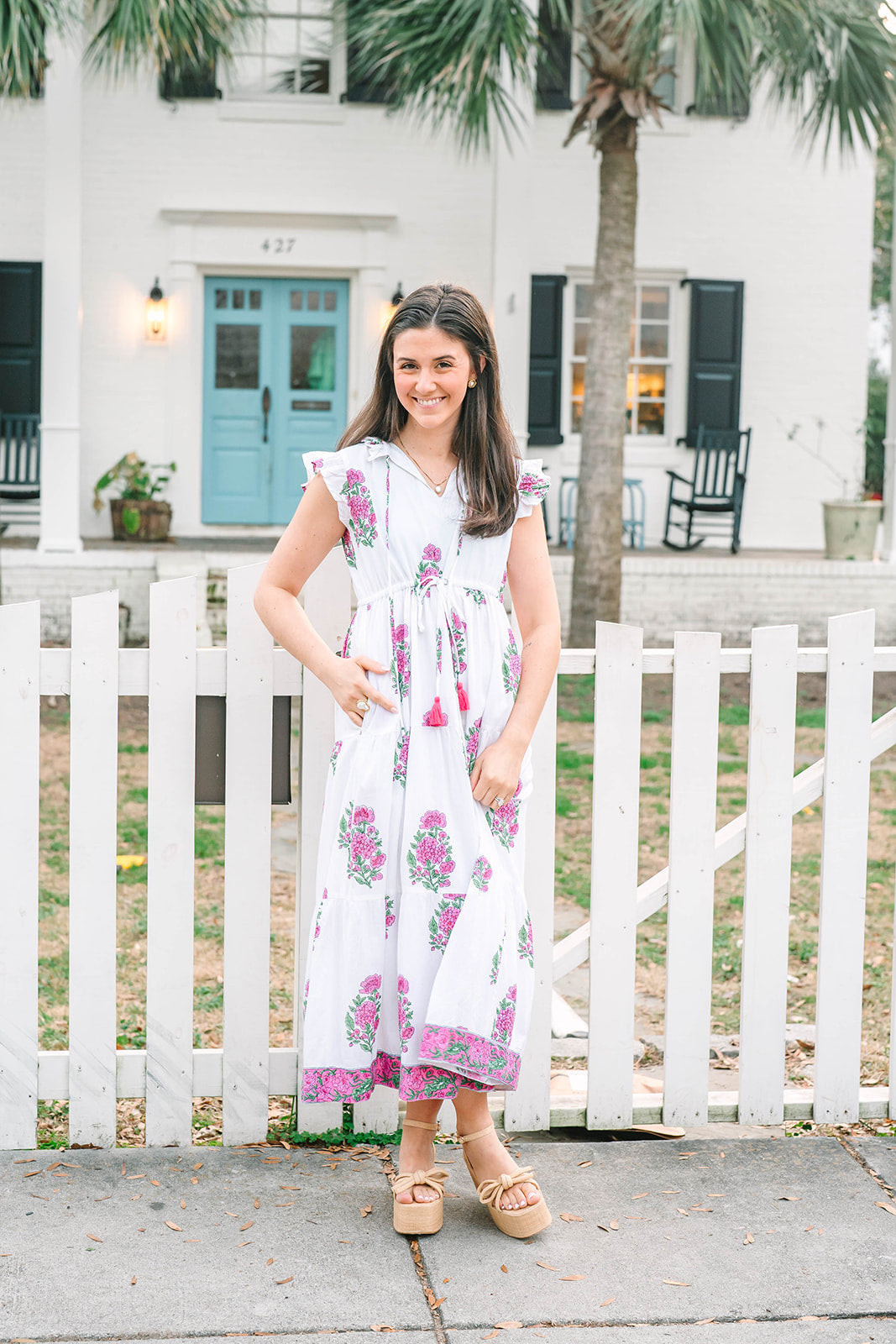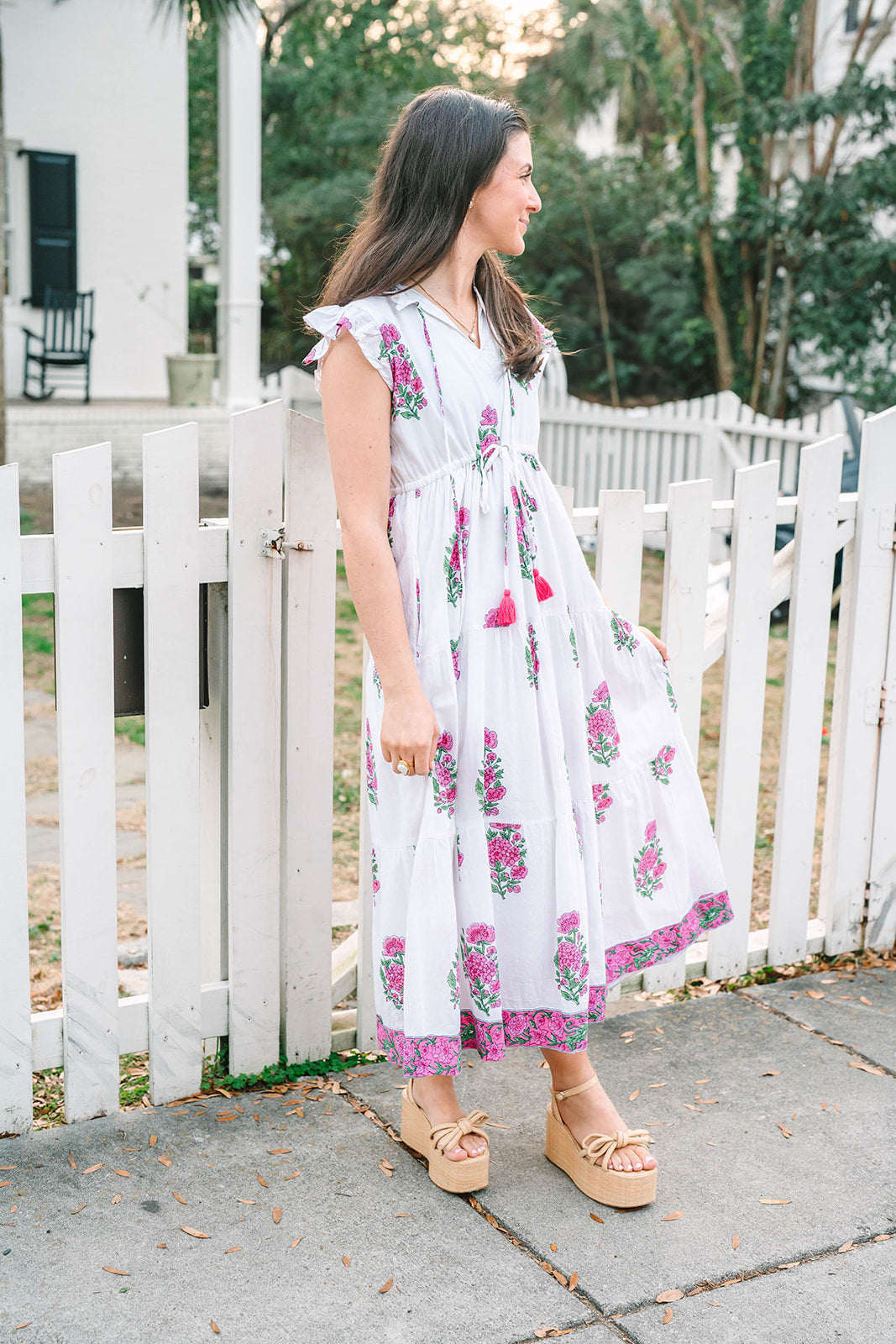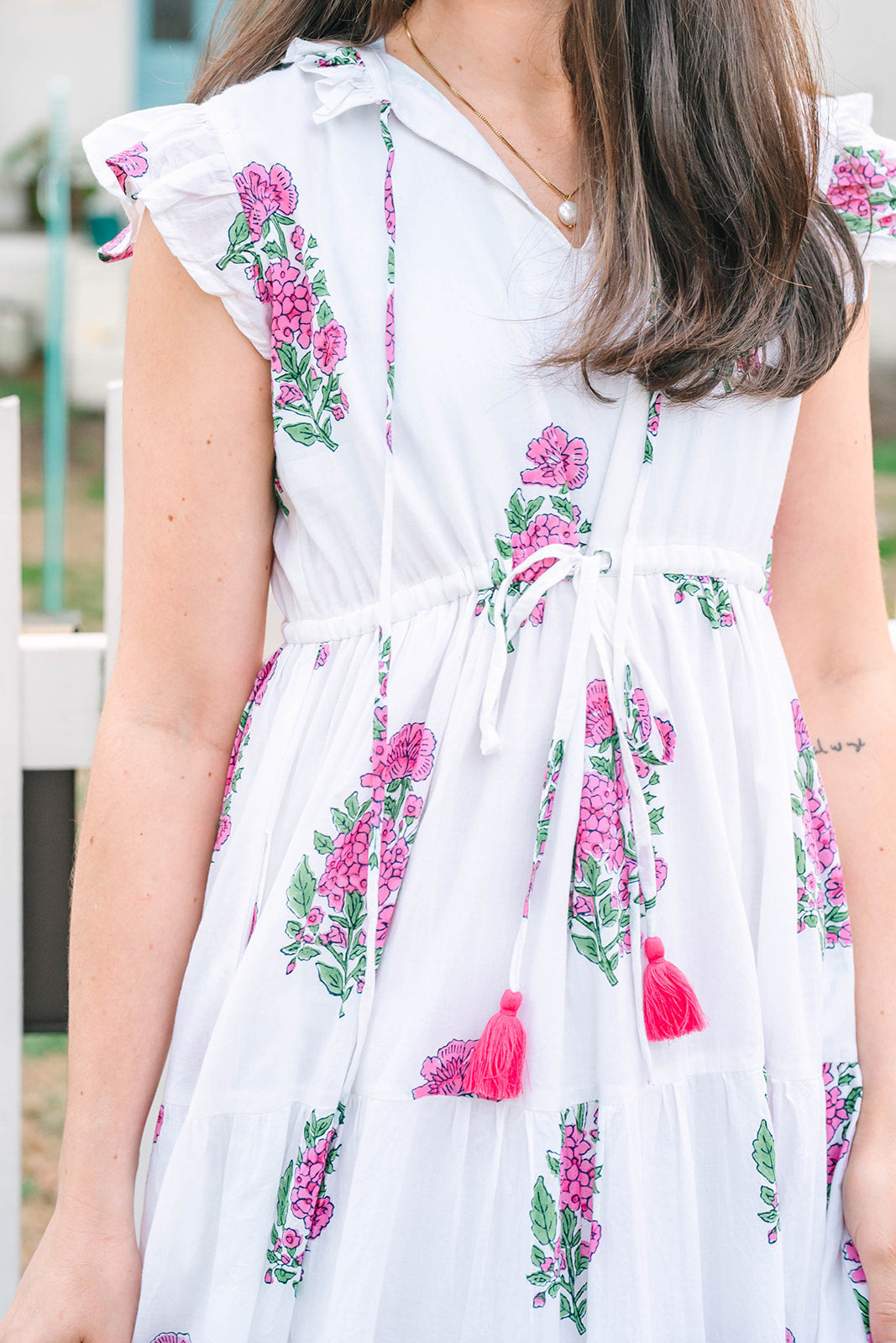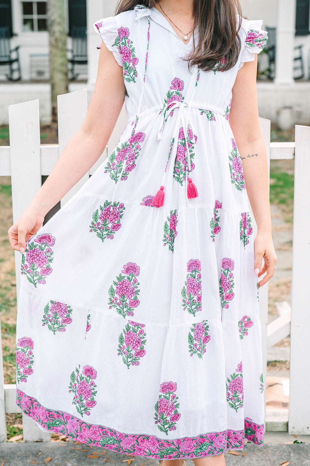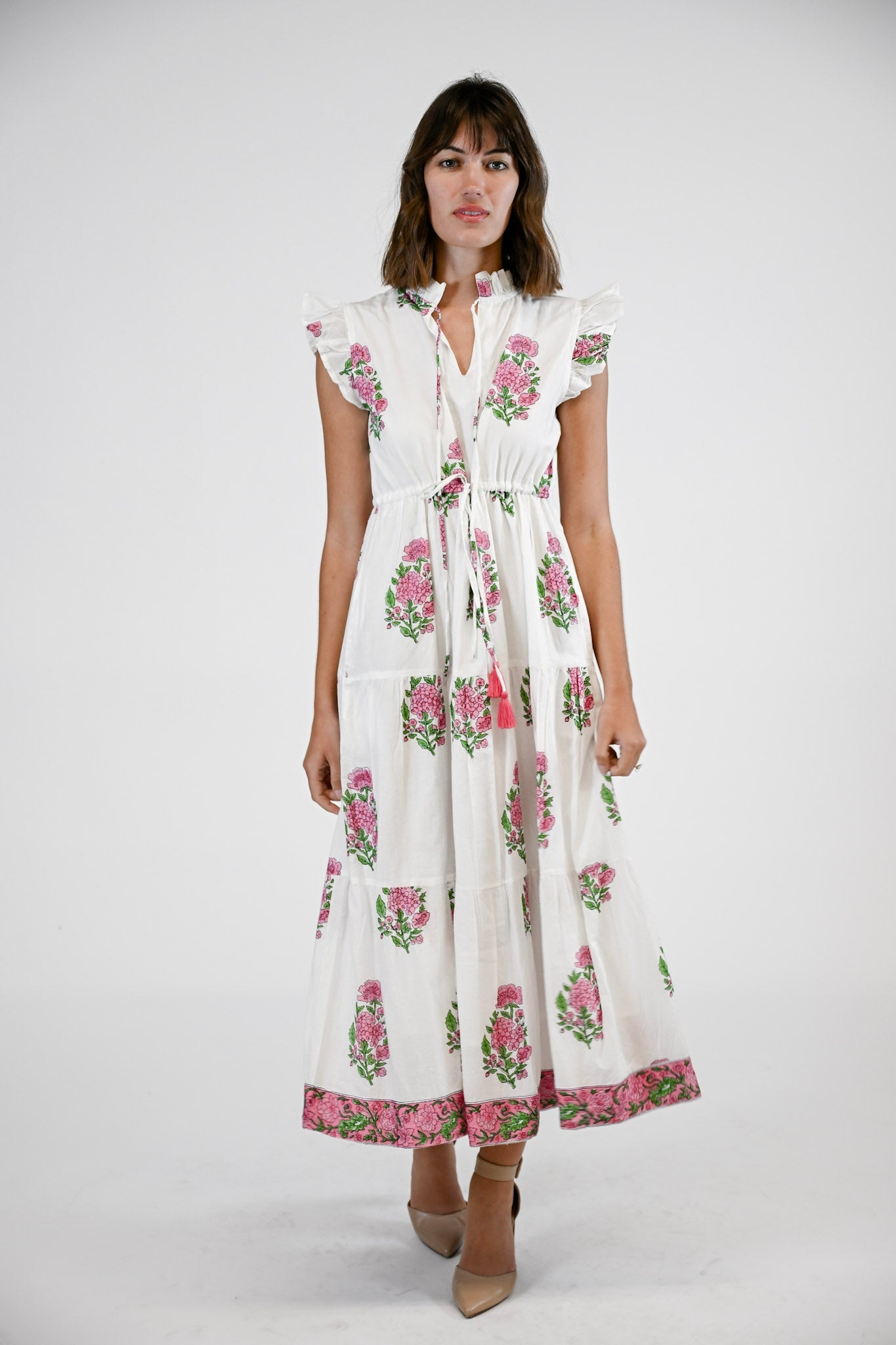 Effortlessly feminine and endlessly flattering, the Shiloh Dress is designed for both comfort and style. Featuring a ruffled collar with tassel tie closure and flutter cap sleeves, this silhouette embodies playful sophistication. An adjustable drawstring waist ensures a customizable fit, while the tiered skirt and side pockets add ease and practicality. Perfect for a day out, the Shiloh blends charm and versatility in equal measure.