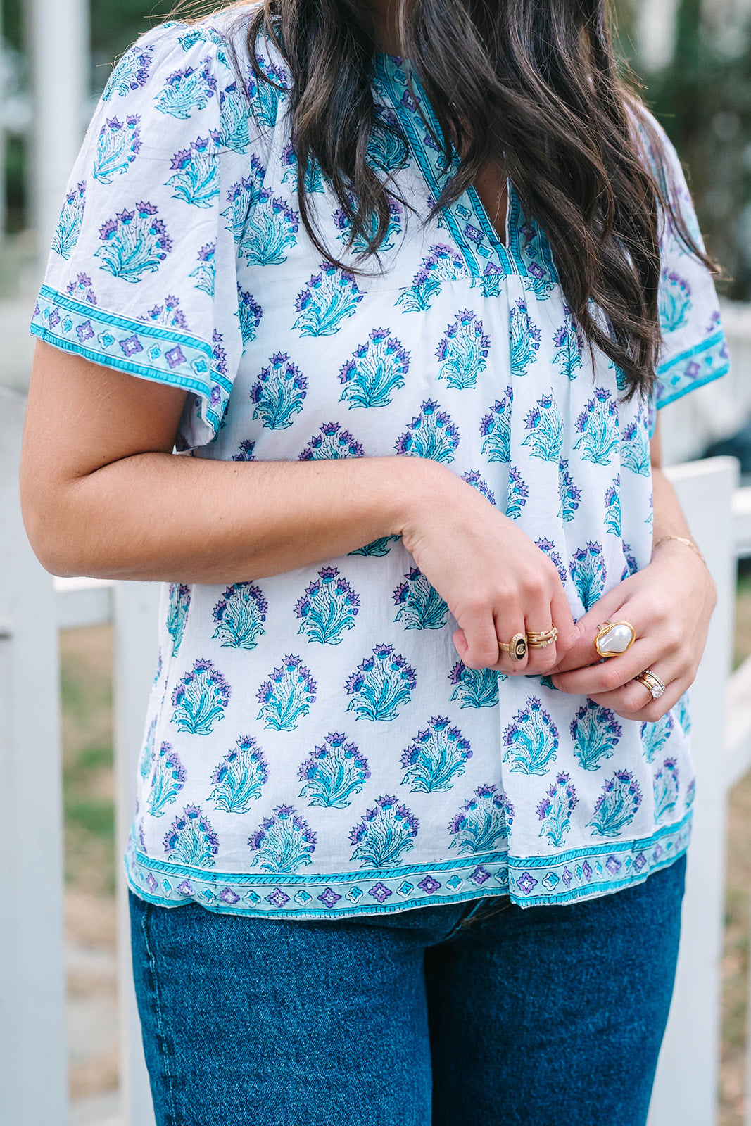 Feminine and timeless, the Vera Blouse is a beautiful blend of effortless style and refined detail. Designed with short bell sleeves and a flattering V-neckline, this silhouette is accented by intricate embroidered trim along the neckline, sleeves, and hem. Elegant yet easy to wear, the Vera adds a touch of sophistication to any look—perfect for both casual days and elevated occasions.